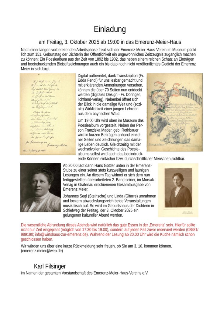 Vorstellung des Poesie-Albums einer Waldkirchner Zeitgenossin Emerenz Meiers - später liest Hans Göttler aus der Neuauflage des 2. Bandes der Emerenz-Meier-Gesamtausgabe